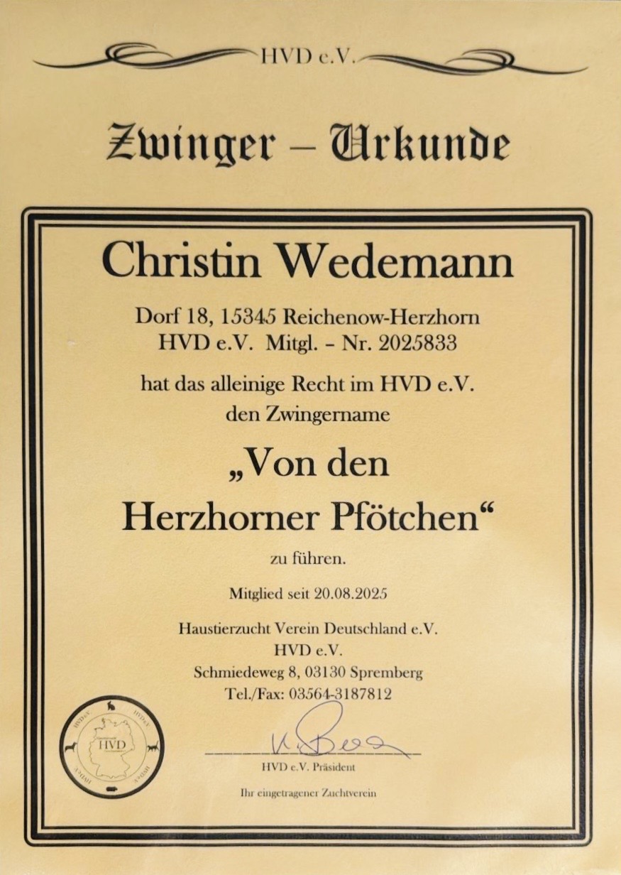Von Juni 2021 bis August 2025 waren wir im Zuchtverein VRZ-DHS-OST aktiv, bevor wir unsere Zucht dem HVD angeschlossen haben.